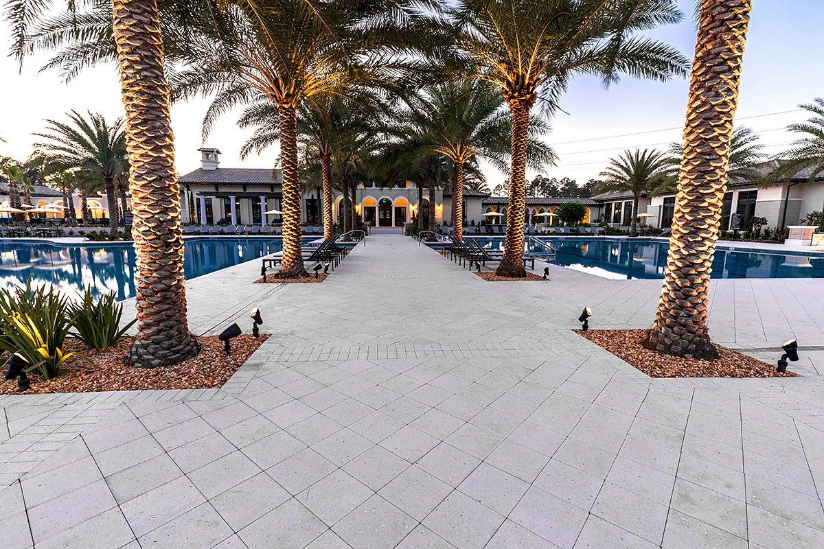 Majestic courts in shellstone, travertine, or porcelain pavers for heirloom elegance.